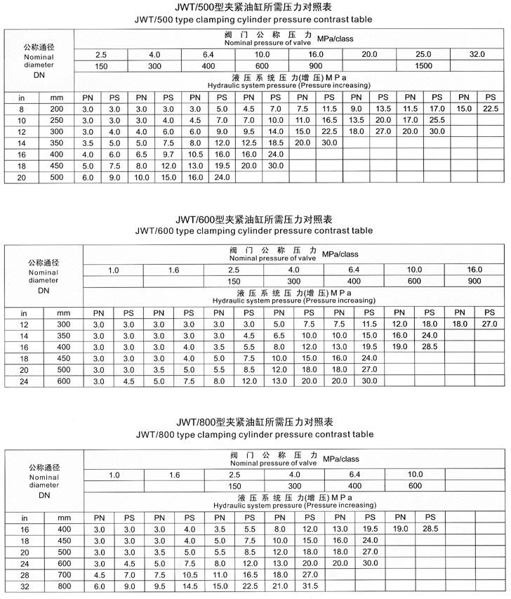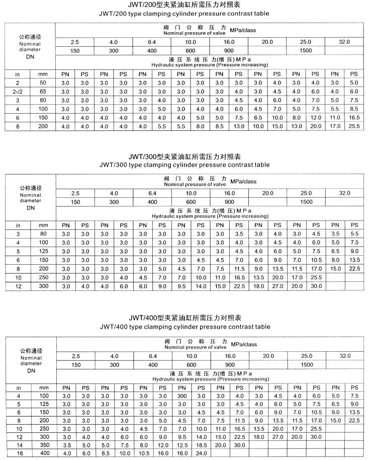 五、測試閥門時,首先根據被試閥門試驗要求參照《壓緊油缸所需壓力對照表》進行試驗壓力增壓調節。嚴禁增壓超高壓工作。防止被試閥門變形損壞。
