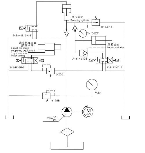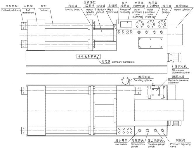 四、接通電源,按油泵起動,檢查電機轉動方向是否正確(順時針方向),調節油泵壓力在5 0MPa進行試機,檢查各管路有無泄漏,發現不良現象應立即進行檢修。